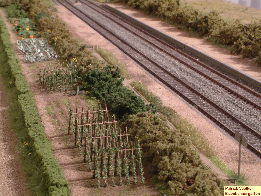 Auch aus dem Zug muss man damals den Garten gesehen haben. Die Sonnenblumen (Busch) lockern die Szene etwas auf. Immer darauf achten: Alle Sonnenblumen in die ungefähr gleiche Richtung gedreht verbauen!