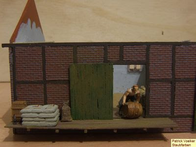 Jetzt geht es los mit der Staubfarbe. Den Ton "Asche" tupfe ich kräftig auf, so dass der Staub satt in die Fugen gedrückt wird. Ohne die Ladegüter auf der Rampe wäre es einfacher gewesen.