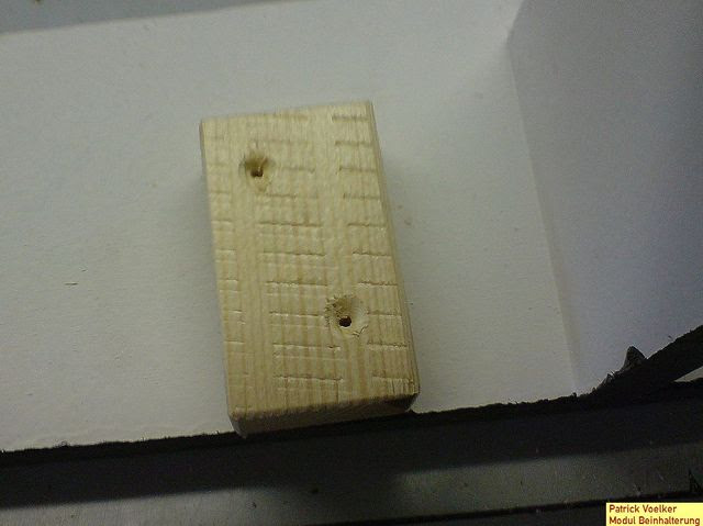 Ein 60 mm langer Klotz aus wird versetzt (sonst spaltet er sich) vorgebohrt und vorgesenkt.